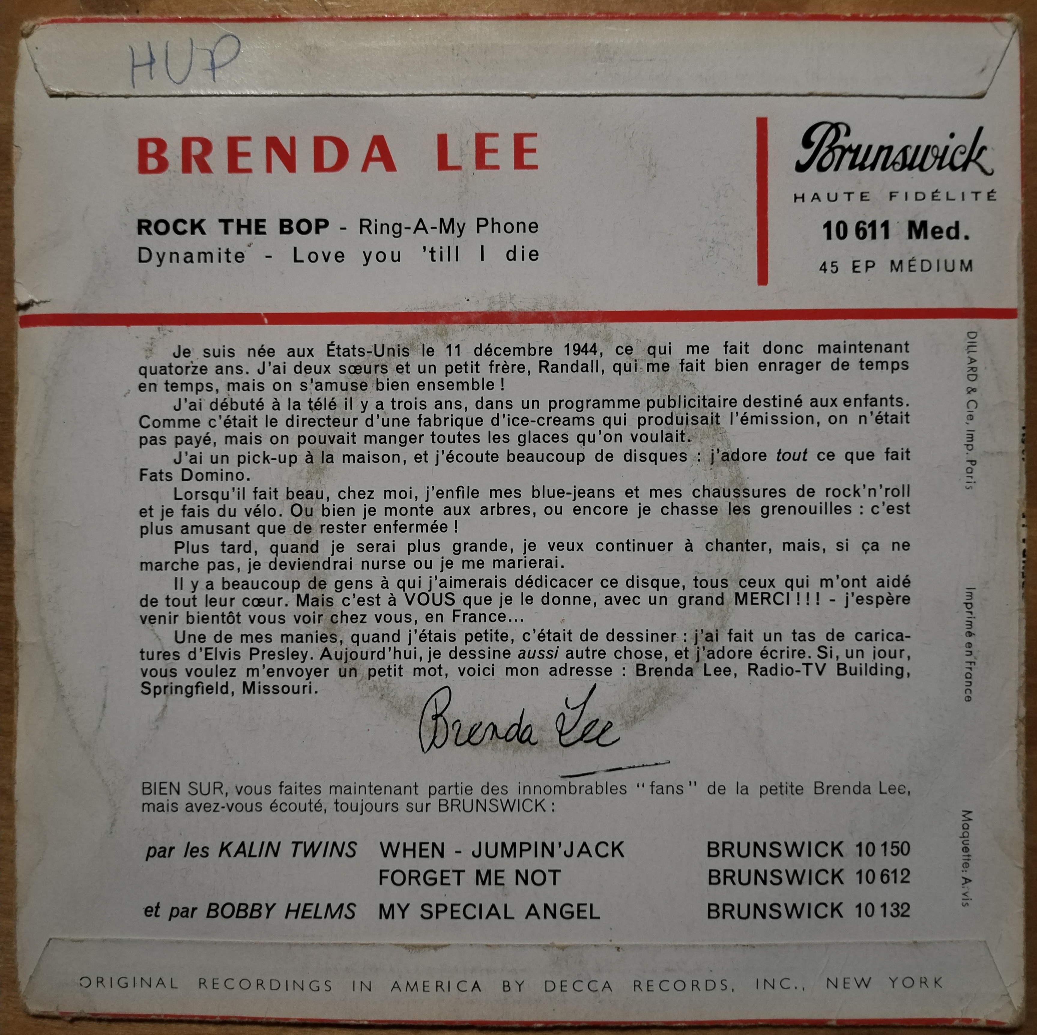 Autograph on sticker Olympia (french music-hall in Paris) Record VG sleeve VG